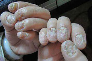 2、甲板變脆易碎:真菌侵入甲板和甲床,在角質(zhì)溶解酶的作用下,角質(zhì)蛋白被溶解,形成角質(zhì)細(xì)小顆粒,角質(zhì)顆粒呈粉末狀易于脫落、松散而變得碎雜,被破壞的甲板缺乏彈性和韌性而變脆。