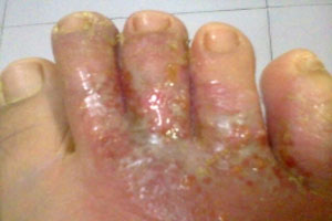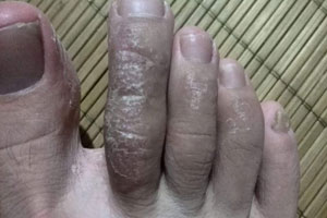 1、糜爛型:好發(fā)于第三與第四,第四與第五趾間。初起趾間潮濕,浸漬發(fā)白或起小水皰,干涸脫屑后,剝去皮屑為濕潤、潮紅的糜爛面,有奇癢,易繼發(fā)感染。