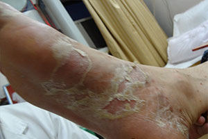 2、水皰型:好發(fā)于足緣部。初起為壁厚飽滿的小水皰,有的可融合成大皰,皰液透明,周圍無紅暈。自覺奇癢,搔抓后常因繼發(fā)感染而引起丹毒、淋巴管炎等。