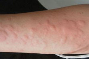 6、蕁麻疹:蕁麻疹是一種常見的過敏性皮膚病,在接觸過敏原的時候,會在身體不特定的部位,冒出一塊塊形狀、大小不一的紅色斑塊,這些產(chǎn)生斑塊的部位,會發(fā)生發(fā)癢的情形,如果沒有停止接觸過敏原并加以治療,出疹發(fā)癢的情形就會加劇。
