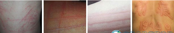 4、人工(劃痕性)蕁麻疹:又叫皮膚化痕癥,多見于過敏體質人群,皮膚經(jīng)劃后可出現(xiàn)條條紅斑,其邊緣伴有紅暈,并有瘙癢癥狀。