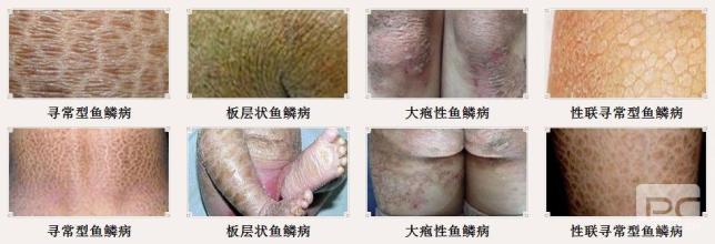 尋常型魚鱗?。?/strong>主要表現(xiàn)在四肢伸側(cè)和軀干的燥性褐色菱形,或多角性鱗屑,上臂及大腿伸側(cè)常有明顯的毛囊角化性丘疹,掌趾受累。發(fā)病率很高,其角化性鱗屑是數(shù)層角質(zhì)細(xì)胞不脫落堆積所致,多于出生后數(shù)月出現(xiàn),5歲左右最重,青春期后癥狀可能減輕但隨著年齡的增大和治療不當(dāng)病情加重。