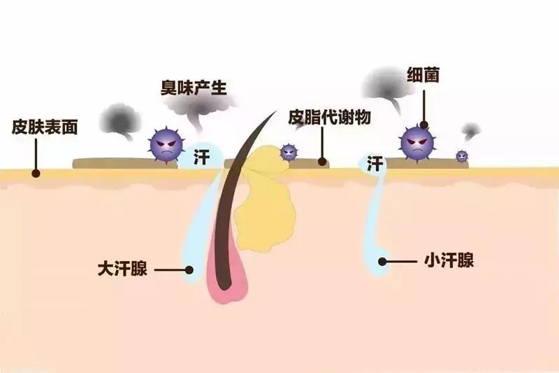 形成腋臭的主要是因為分布于腋下皮膚真皮層,開口于毛根部的頂漿汗腺(又名大汗腺),會分泌較濃稠的液體(主要為油脂、蛋白質(zhì)、淀粉),經(jīng)腋下上的細(xì)菌分解分泌從而形成的惡臭味的短鏈脂肪酸和氨。大蒜、砷劑通過小汗腺排泄也易形成臭味。除了汗腺分泌,遺傳、生理、個人生活習(xí)慣都可以形成腋臭。