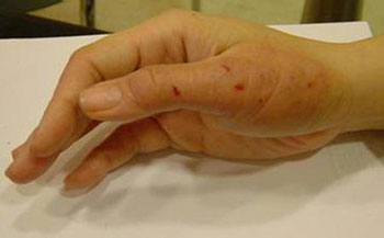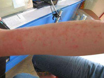 2、丘疹性蕁麻疹:丘疹性蕁麻疹又稱急性單純性癢疹。典型皮損為綠豆或稍大淡紅色丘疹,性質(zhì)堅(jiān)硬,頂端常有小皰,搔破后結(jié)痂,周圍有紡錘形紅暈,經(jīng)搔抓后呈現(xiàn)風(fēng)團(tuán)。該病好發(fā)于軀干及四肢近端,損害數(shù)目不定,常分批出現(xiàn),散在發(fā)生或少數(shù)簇集,常伴有胃腸障礙,少數(shù)患者有時亦有呈現(xiàn)水皰者。